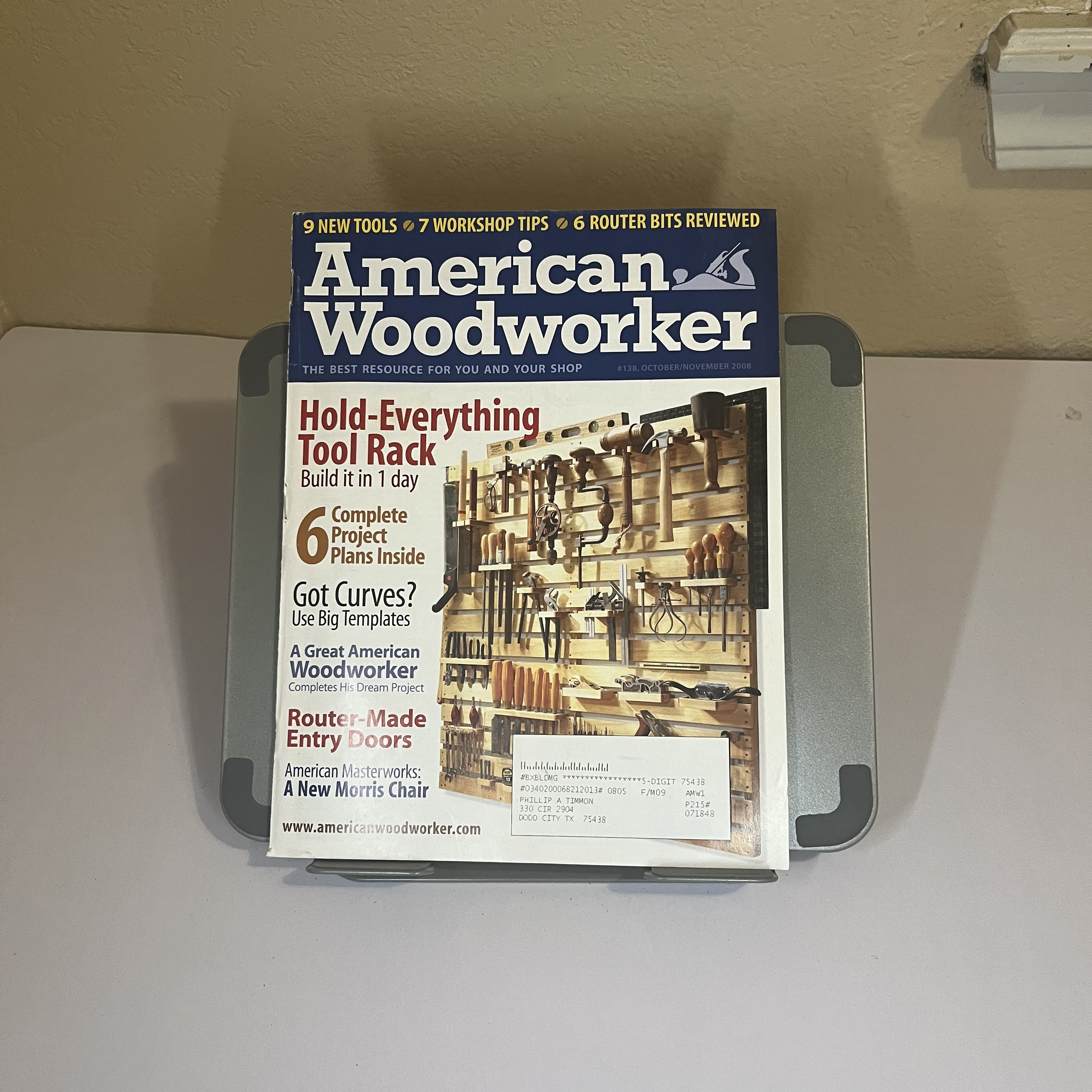 Discover the satisfaction of a well-organized shop with this October/November 2008 issue of American Woodworker. The cover story features complete plans for building a versatile 'Hold-Everything Tool Rack,' a popular project during the height of the modern DIY movement. At this time, creating efficient and personalized home workshops was a key focus for hobbyists. This collectible issue also contains project plans for a new Morris Chair and techniques for crafting router-made entry doors, offering a blend of practical organization and classic craftsmanship.