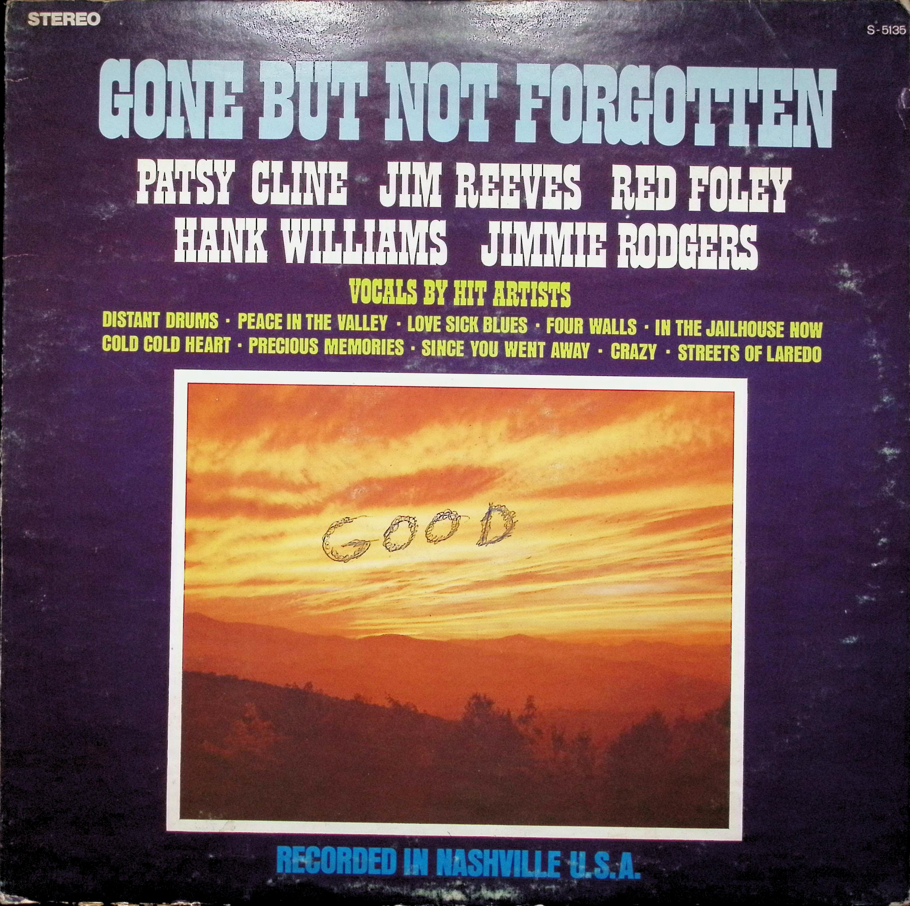 This compilation LP, "Gone But Not Forgotten," features legendary country artists Patsy Cline, Jim Reeves, Red Foley, Hank Williams, and Jimmie Rodgers. Released on Alshire Records as part of the Country & Western Series, this US release includes classic tracks such as "Love Sick Blues," "Crazy," "Cold Cold Heart," and "Four Walls." A must-have for any classic country music enthusiast.
