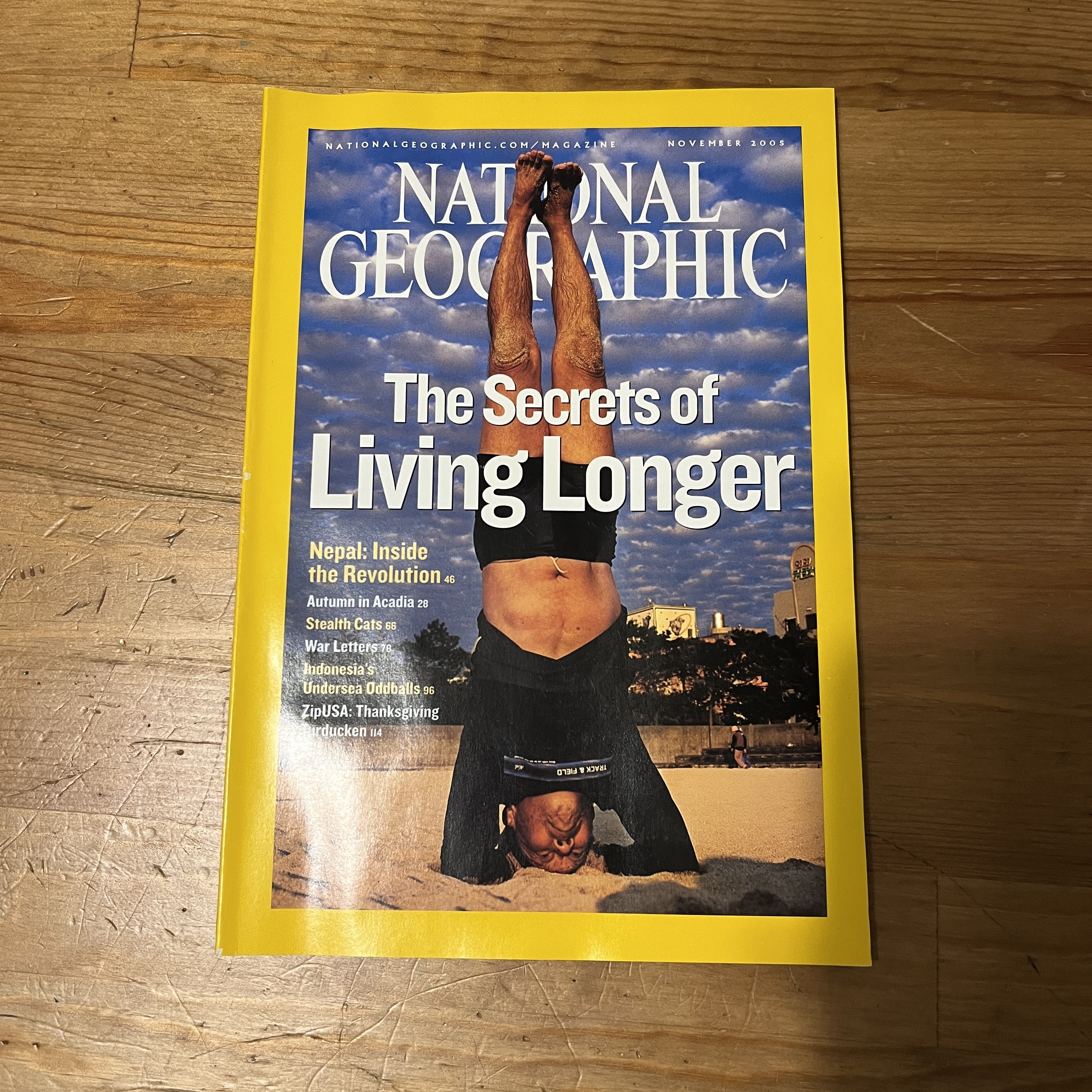 Explore the globe with this November 2005 issue of National Geographic, featuring the compelling cover story 'The Secrets of Living Longer.' At a time when wellness and lifestyle science were gaining major public interest, this article delves into the habits of the world's longest-living communities. This piece captured the 2000s zeitgeist of seeking holistic, science-backed approaches to health and aging. This collectible issue also includes fascinating reports on the revolution in Nepal, stealth cats, and Indonesia's unique marine life.