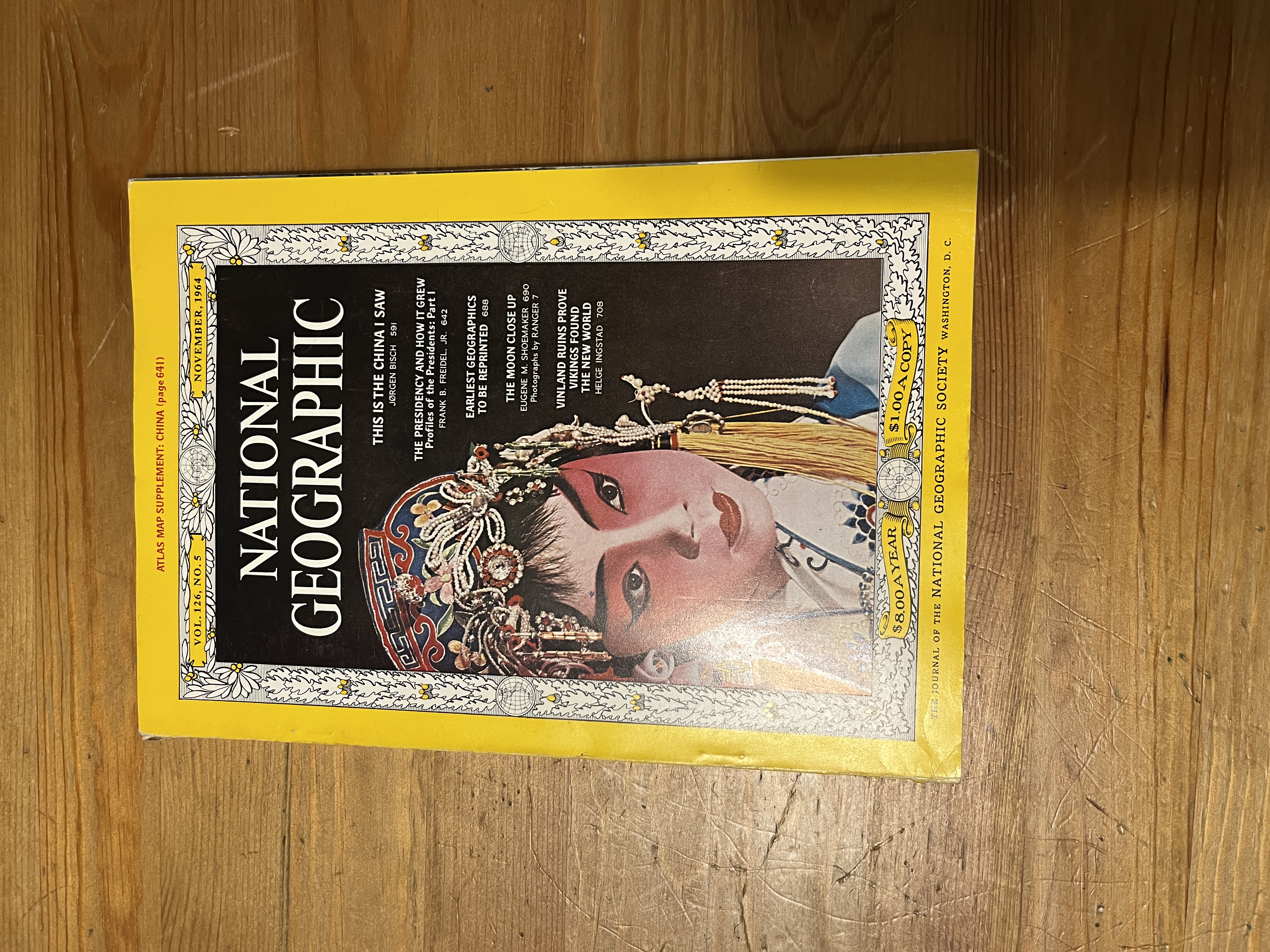 Explore the world of 1964 with this vintage issue of National Geographic. The striking cover features a traditional Chinese opera performer, introducing a rare and fascinating photo-essay on a China largely closed off to the West at the time. This issue offers a unique glimpse into a nation's ancient culture amidst the backdrop of the Cold War. Also includes breathtaking first-hand photos of the moon from the Ranger 7 probe, an article proving Vikings reached the New World, and a supplement map of China.