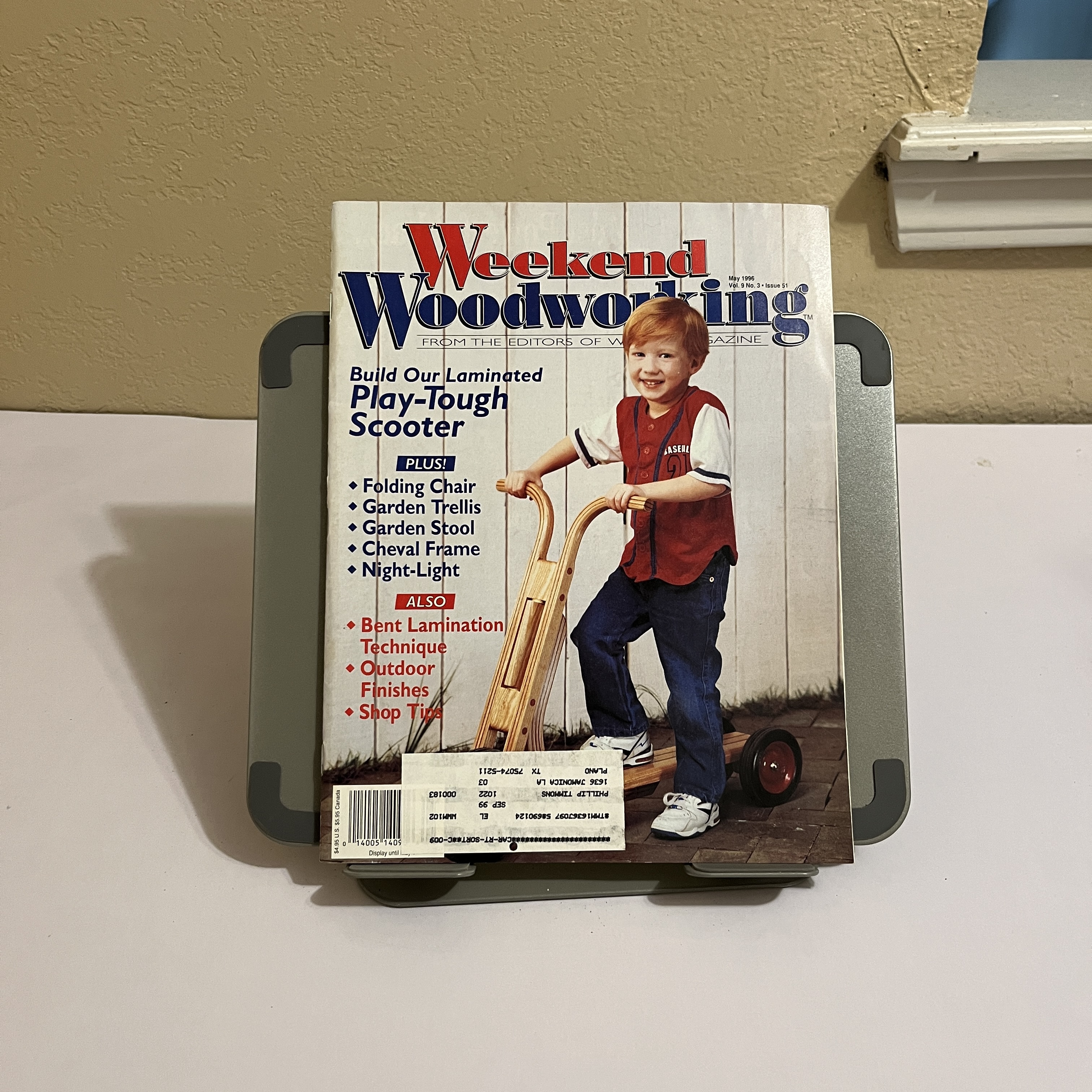 Explore vintage woodworking with the May 1996 issue of Weekend Woodworking. The cover story features a detailed plan for a durable, laminated wooden scooter, a classic project reflecting the 1990s appreciation for handmade children's toys. This edition also includes plans for a folding chair, garden trellis, and a garden stool, offering a variety of projects for all skill levels. A perfect find for woodworking enthusiasts, collectors of 90s craft magazines, or anyone looking for nostalgic project inspiration.