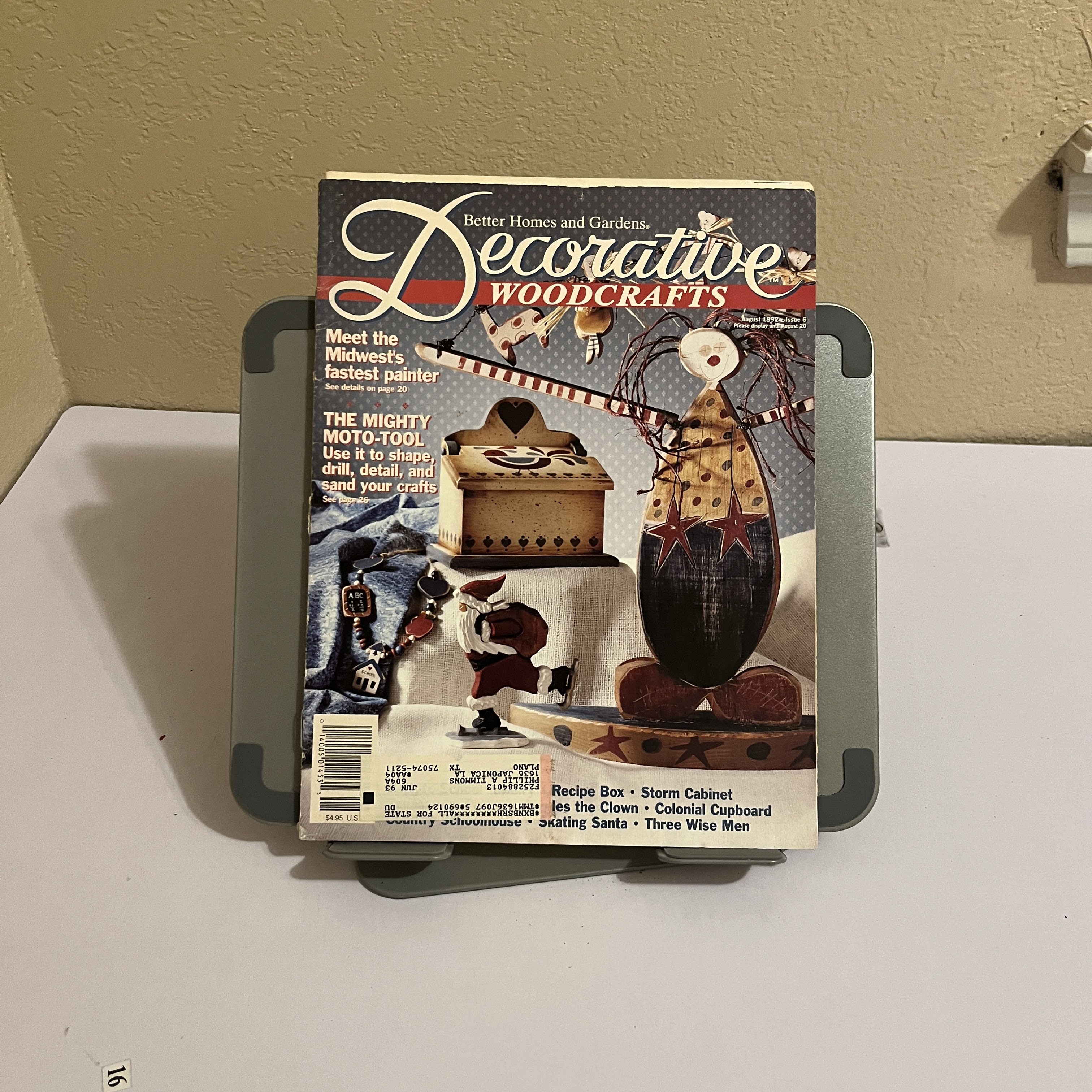A vintage August 1992 issue of Better Homes and Gardens' Decorative Woodcrafts. This magazine is a perfect time capsule of the early 1990s country craft and folk art revival. The cover features charming projects like a skating Santa, a folk art clown, and a decorative recipe box, all representative of the popular tole and decorative painting styles of the era. Inside, find patterns and inspiration for creating your own handmade wooden decor, a beloved hobby from the nineties.