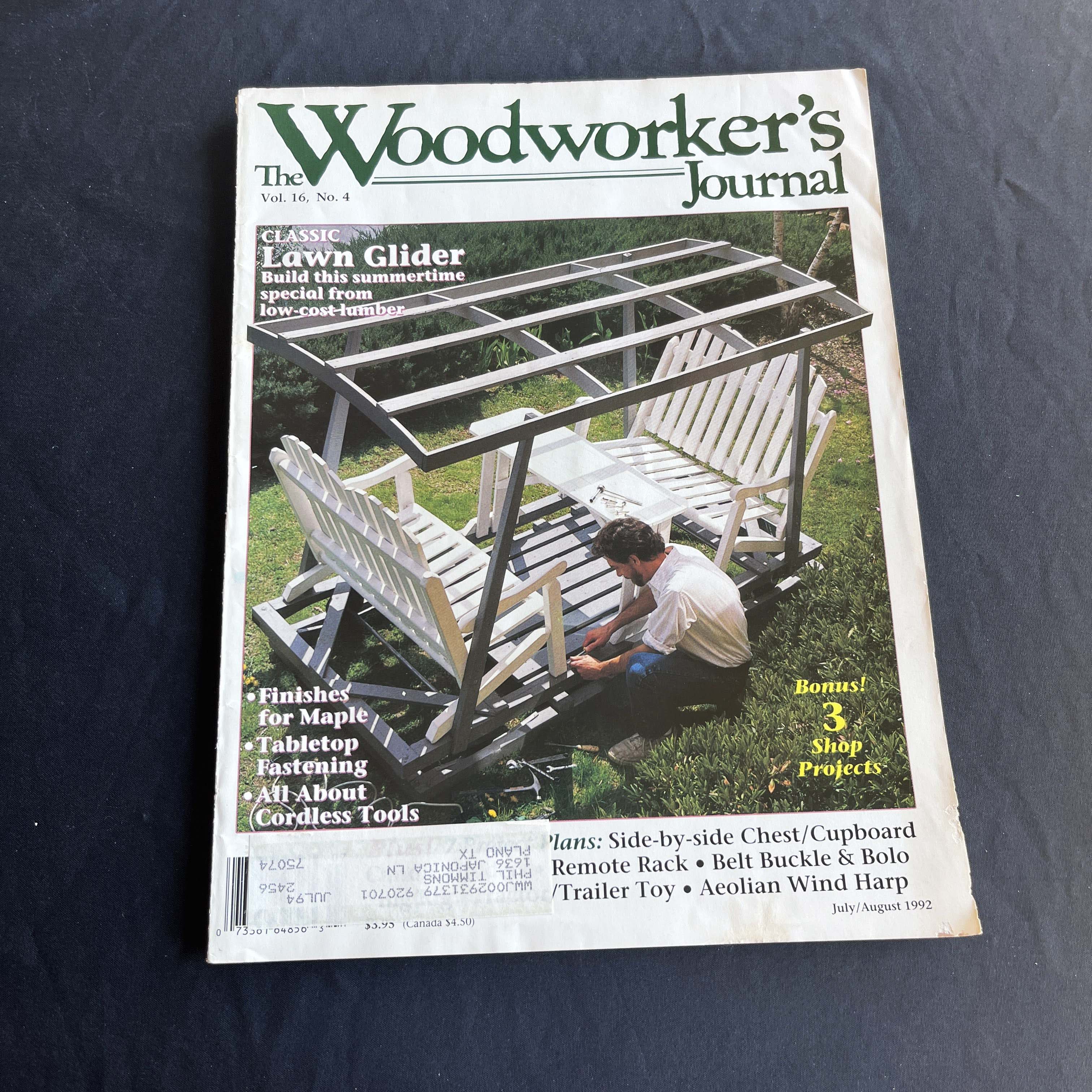 This is the July/August 1992 issue of The Woodworker's Journal, a must-have for any woodworking enthusiast. The cover story features detailed plans for building a classic lawn glider, a quintessential piece of American outdoor furniture. This issue also captures the early '90s DIY spirit with a special feature on the rise of cordless tools, making workshop projects more accessible than ever. Additional plans include a side-by-side chest, a remote rack, and even an Aeolian wind harp.