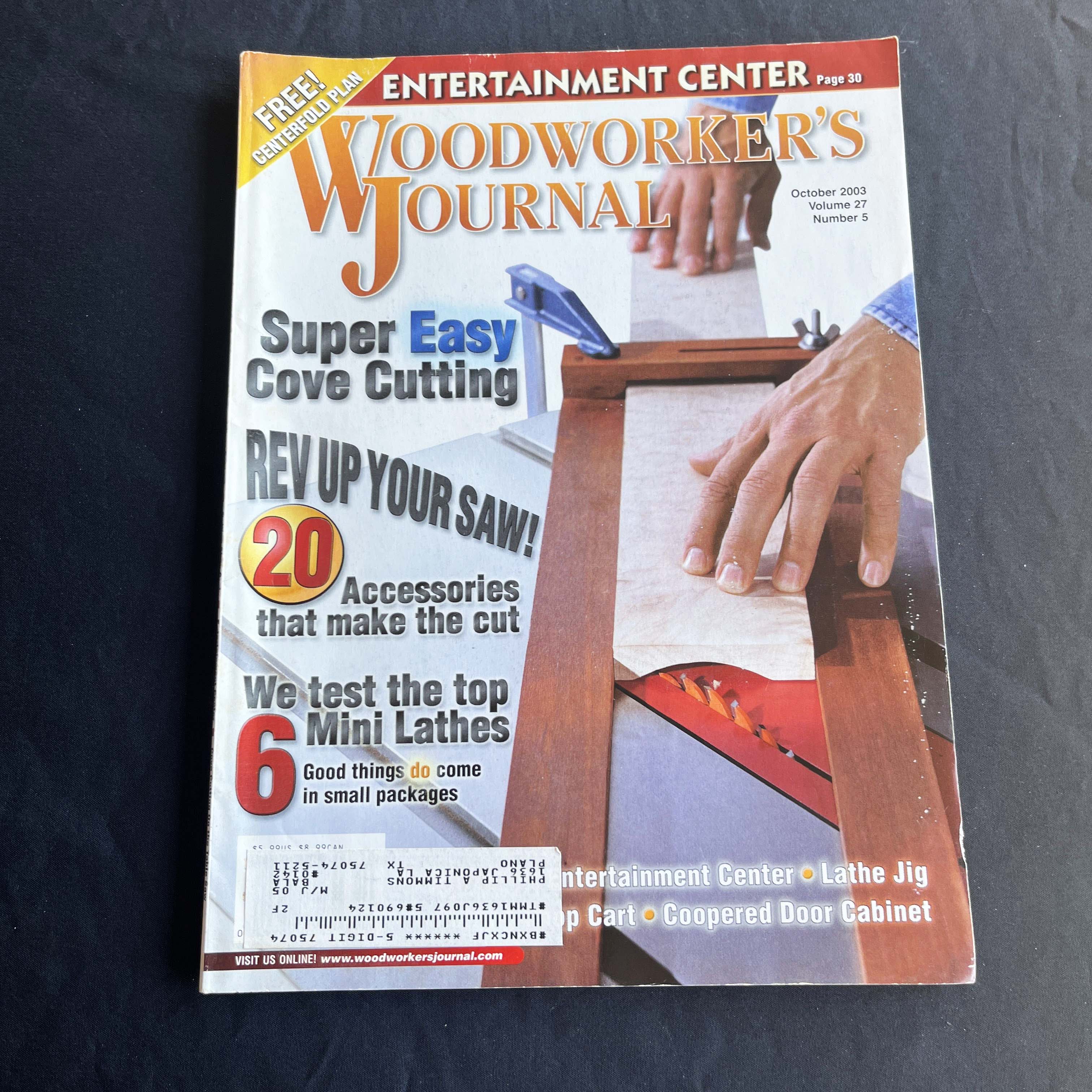 Explore woodworking techniques from 2003 with this issue of Woodworker's Journal. It features a free centerfold plan for a classic entertainment center, a popular project during the transition to new home media. Discover valuable tips for super easy cove cutting, a review of top mini lathes, and ideas for 20 essential saw accessories. This magazine is a fantastic resource for hobbyists and a nostalgic look at home workshop projects from the early 2000s.