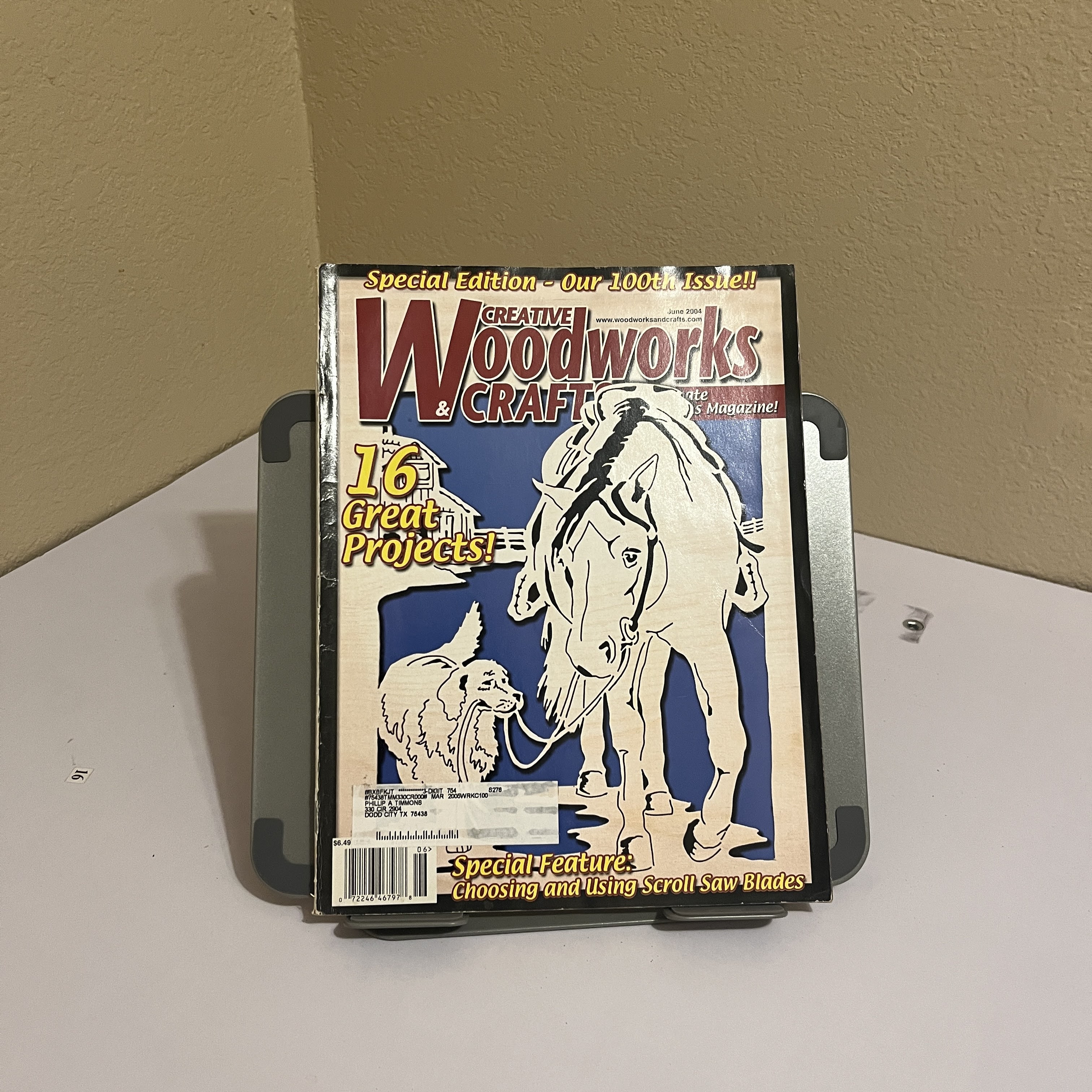 Explore the world of woodworking with the special 100th issue of Creative Woodworks & Crafts from June 2004. This edition features a charming cover with scroll saw art of a horse and dog, a timeless scene reflecting the popular country and Americana crafting aesthetic of the era. Inside, discover 16 great projects and a special feature on choosing and using scroll saw blades. A perfect find for hobbyists, collectors, and anyone passionate about DIY wood projects and intarsia.
