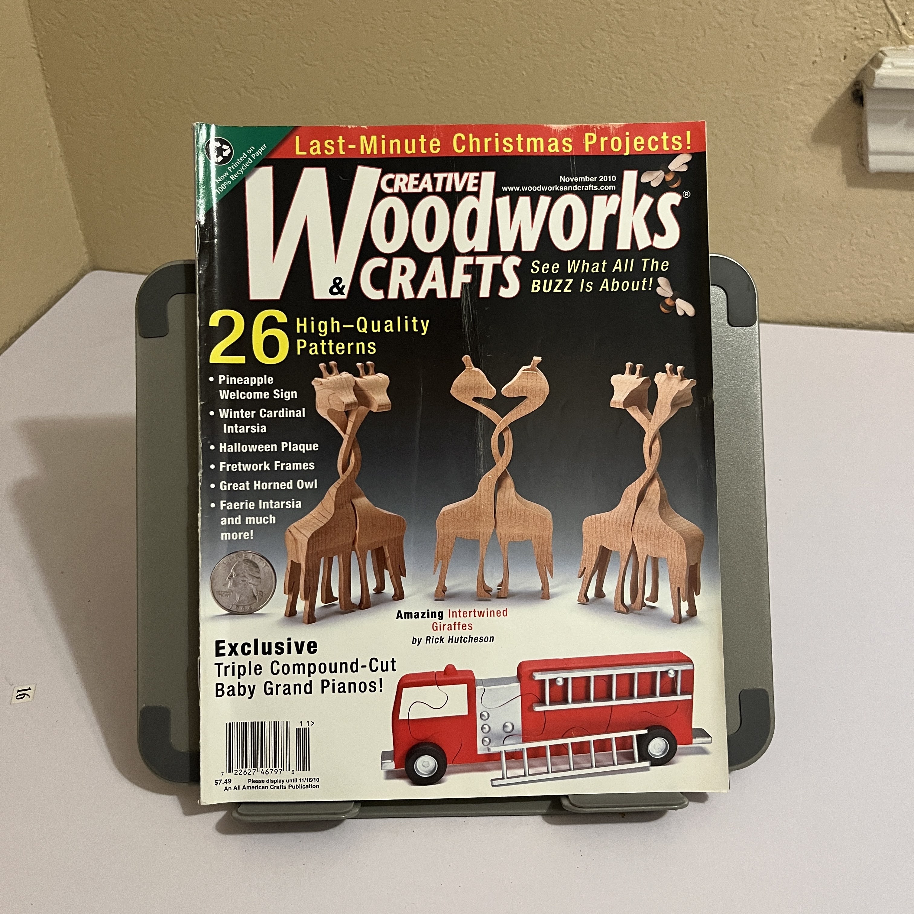 This November 2010 issue of Creative Woodworks & Crafts is a treasure trove for woodworking enthusiasts. It prominently features a pattern for 'Amazing Intertwined Giraffes' by Rick Hutcheson, a project reflecting the intricate scroll saw work popular during this period. The magazine also includes 26 high-quality patterns for various projects, from last-minute Christmas gifts to fretwork frames and intarsia designs. This issue is a great snapshot of the hobbyist woodworking scene of the early 2010s, offering a blend of holiday, seasonal, and decorative project ideas.