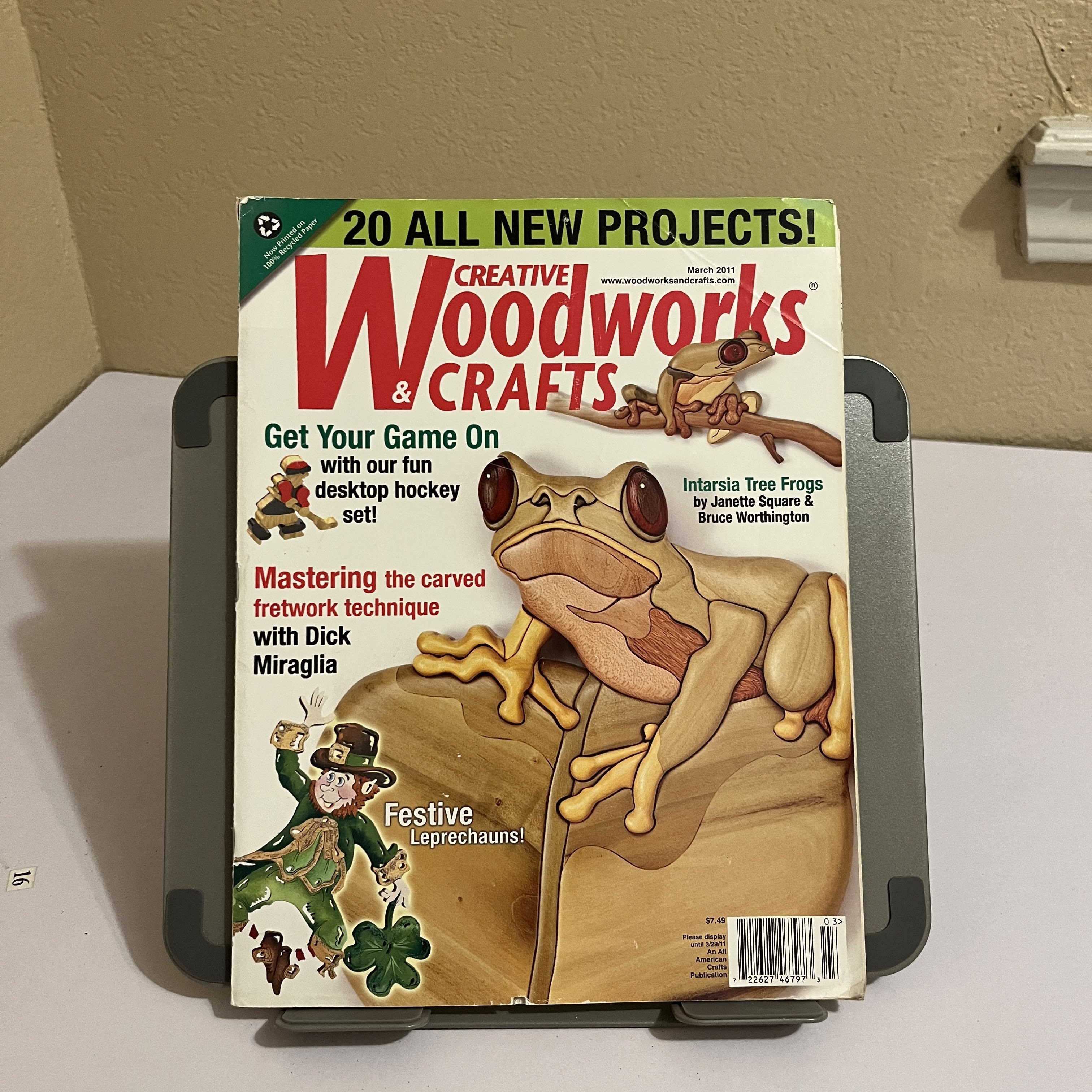 This issue of Creative Woodworks & Crafts from March 2011 showcases the intricate art of intarsia with a stunning tree frog cover project. Intarsia, a mosaic-like woodworking technique, was a beloved form for hobbyists seeking to create detailed wooden pictures. This edition offers 20 new projects, including festive leprechauns and a desktop hockey set, catering to a wide range of woodworking skills and interests. It's an excellent resource for crafters seeking inspiration or collectors of woodworking periodicals from the early 2010s.