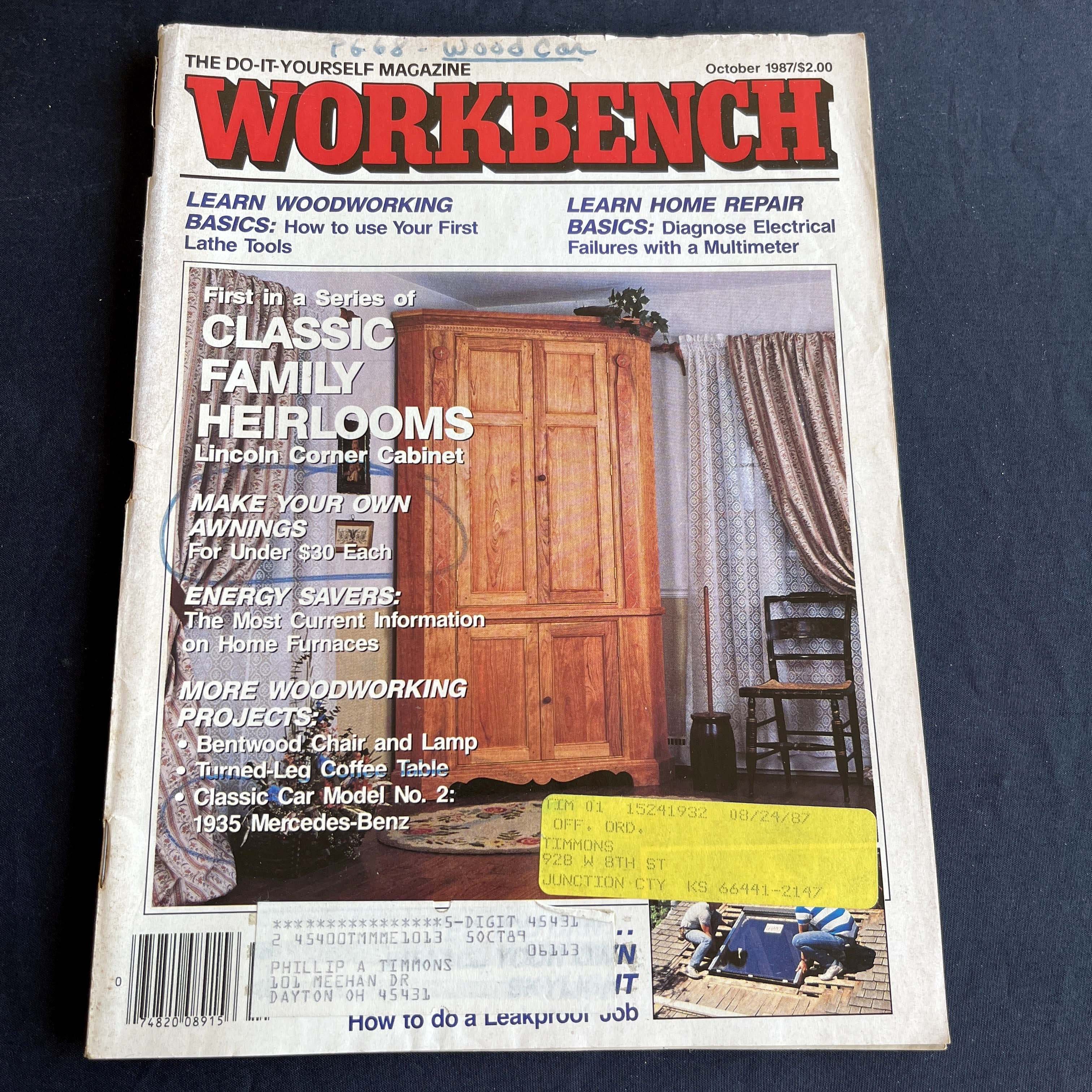 Explore the world of do-it-yourself projects with this October 1987 issue of Workbench magazine. The cover story features detailed plans for a beautiful Lincoln Corner Cabinet, a classic family heirloom project. The late 1980s were a peak time for the DIY movement, with a focus on creating lasting, quality pieces for the home. This issue also includes guides for using lathe tools, home electrical repair, building a model 1935 Mercedes-Benz, and more.