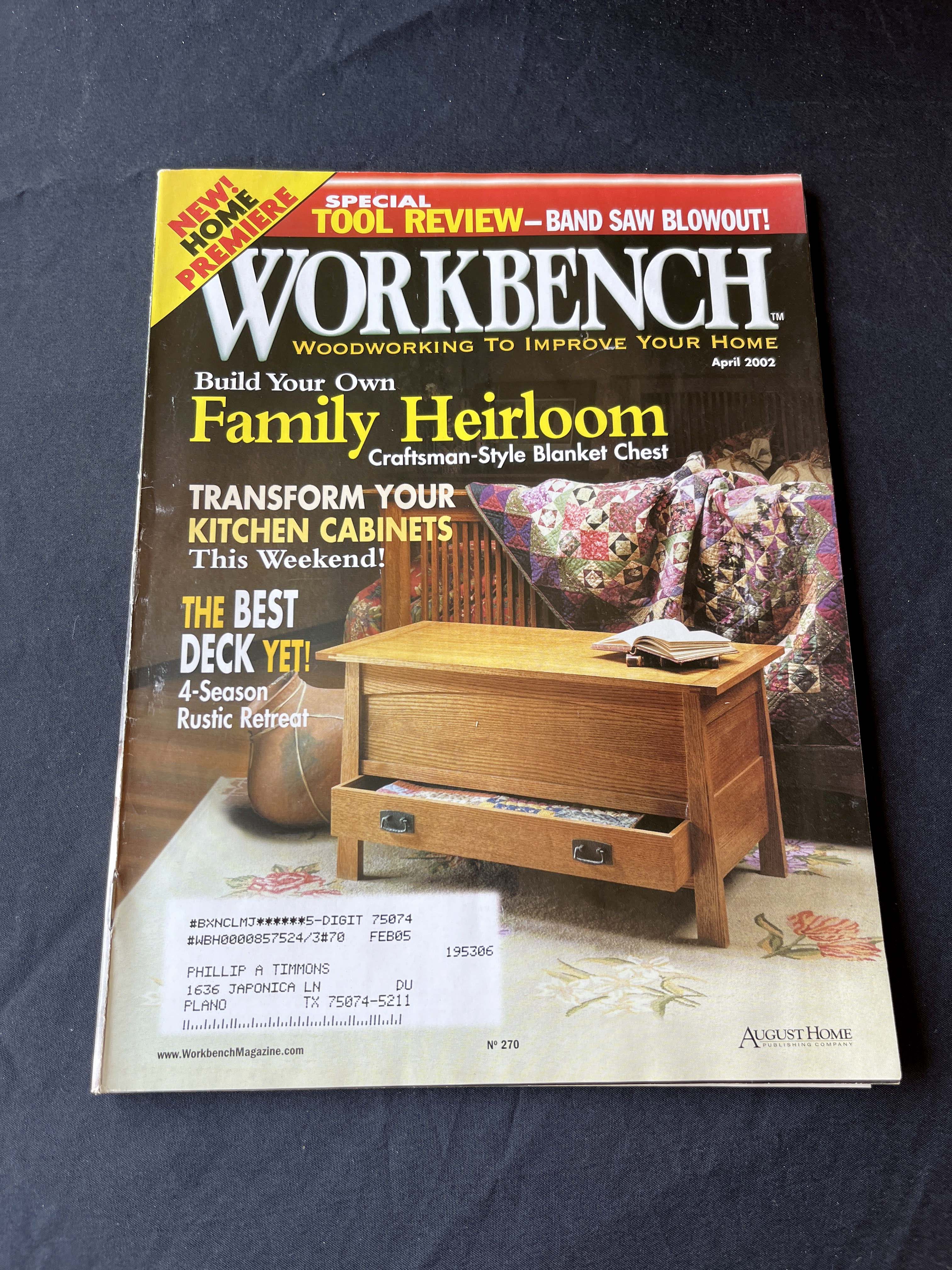 This is the April 2002 issue (No. 270) of Workbench Magazine. The cover story features detailed plans to build a beautiful Craftsman-style blanket chest, a project that tapped into the popular revival of Arts and Crafts furniture in the early 2000s. Also included are guides for transforming kitchen cabinets and building a '4-Season Rustic Retreat' deck. This issue is a fantastic resource for woodworkers, DIY enthusiasts, and anyone interested in home improvement projects from the era.